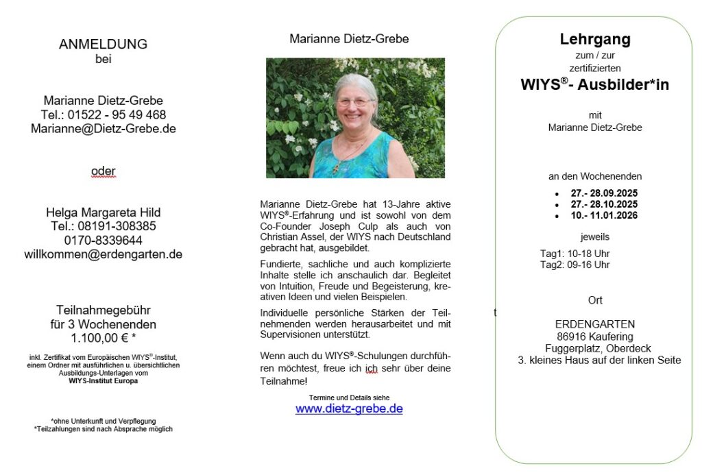 Ich biete einen Lehrgang an, in dem anerkannte WIYS-Practioner zertifiziert werden, selbst WIYS weitergeben zu dürfen. Voraussetzung ist, dass sie selbst zertifiziert sind und WIYS-Praxis besitzen. Dieser Kurs findet statt in 86899 LANDSBERG am LECH.