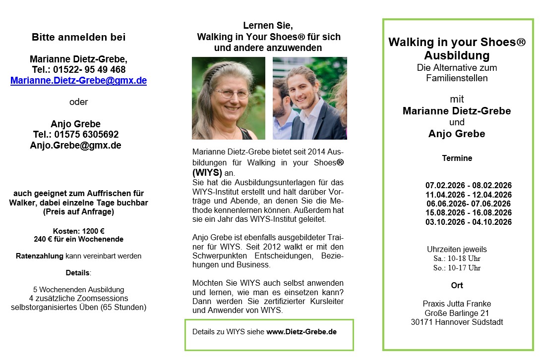 Ich biete bei Bedarf einen Lehrgang an, in dem anerkannte WIYS-Practioner zertifiziert werden, selbst WIYS-Ausbilder zu sein und WIYS weitergeben zu dürfen. Hier der Flyer von 2025